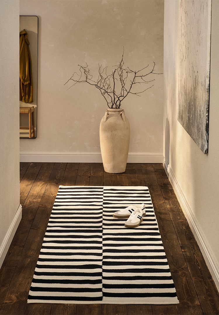 Tidlös i uttrycket, modern i detaljerna: Den handvävda kelimlöparen DONNA imponerar med sin reducerade randiga design i svart och krämvitt, som smidigt passar in i olika typer av inredningar.
