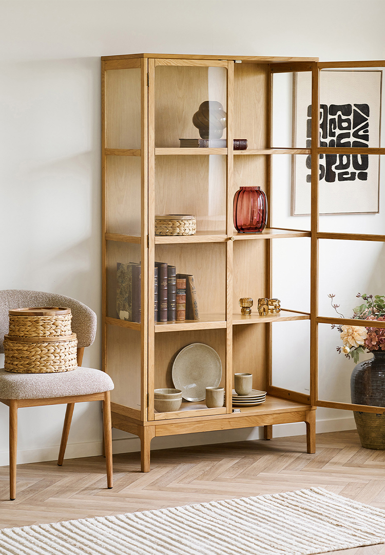 ZAMORA kollektionen från House Nordic, präglad av skandinaviskt purism, förenar den naturliga värmen från ekfanér med en finstämd, ljusfylld glasarkitektur – ett stycke modern mid-century-estetik.